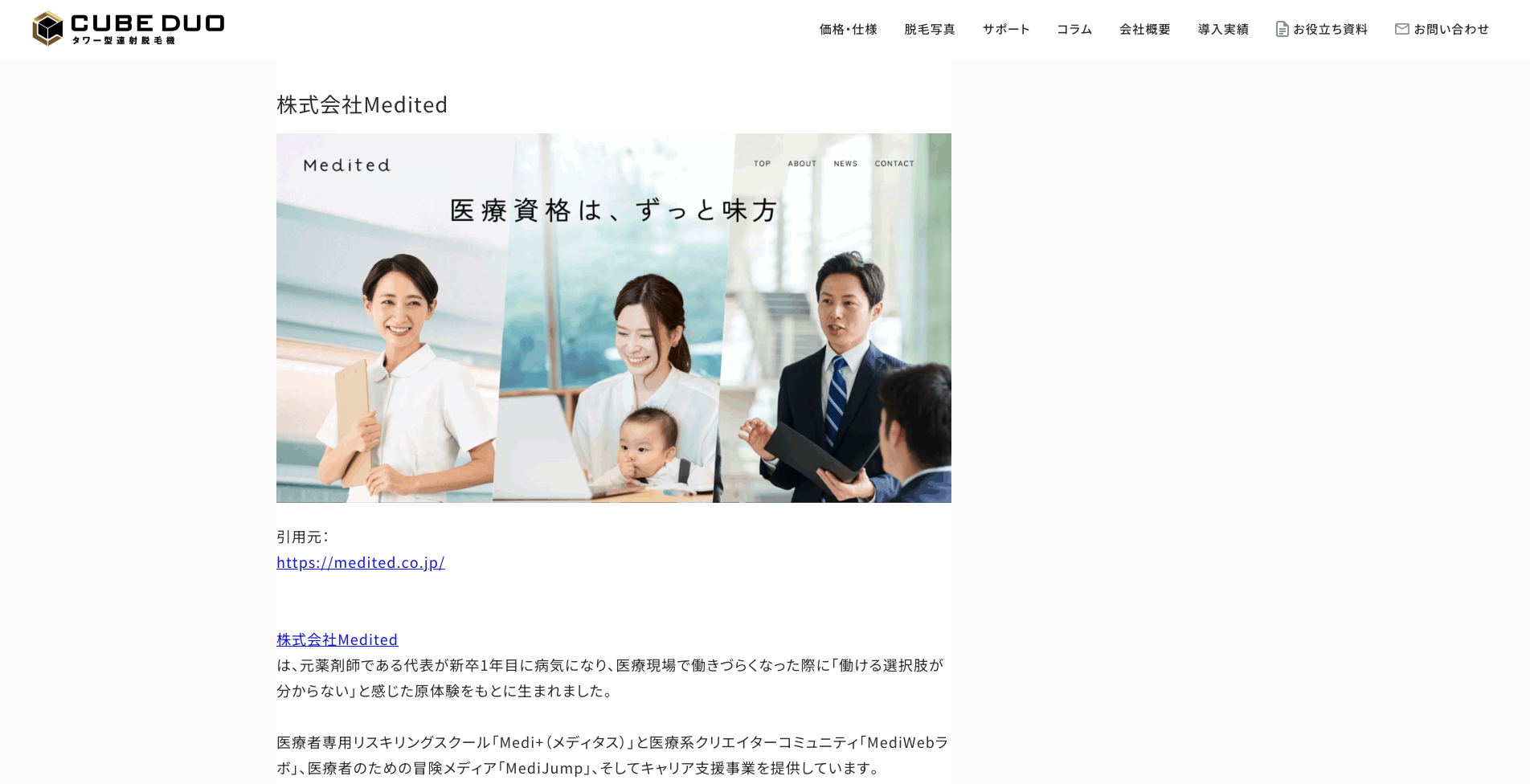 業務用脱毛器「CUBE DUO」を提供する株式会社エクレーヌ の運営するメディア内のコラム記事「医療業界を支える注目の医療関連サービス企業まとめ 」に当社が掲載されました。